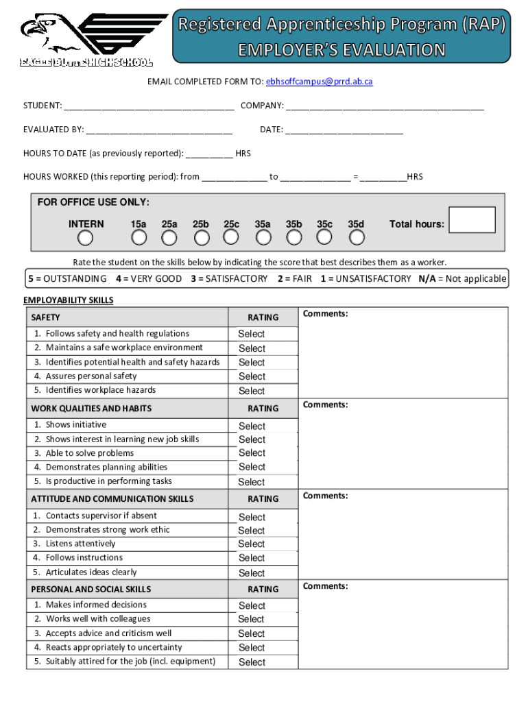 EMAIL COMPLETED FORM TO: ebhsoffcampus@prrd.ab.ca STUDENT: ___ COMPANY: ___ EVALUATED BY: ___DATE: ___HOURS TO DATE (as previously reported): ___ HRS HOURS WORKED (this reporting period): from ___