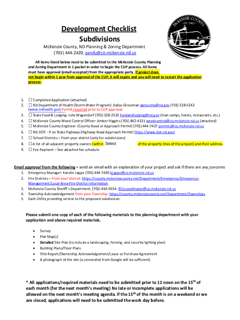 Development Checklist Subdivisions McKenzie County, ND Planning & Zoning Department (701) 4442420, pandz@co.mckenzie.nd.us All items listed below need to be submitted to the McKenzie County Planning