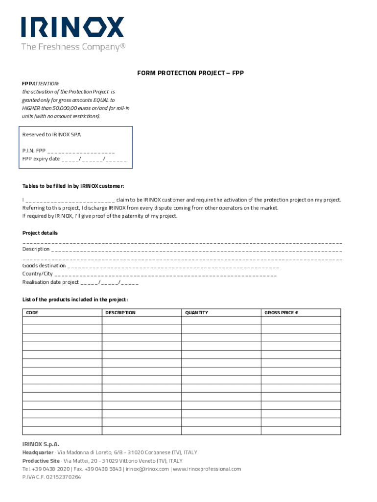 FORM PROTECTION PROJECT FPP ATTENTION: the activation of the Protection Project is granted only for gross amounts EQUAL to HIGHER than 50,000.00 euros or/and for rolling units (with no amount restrictions).