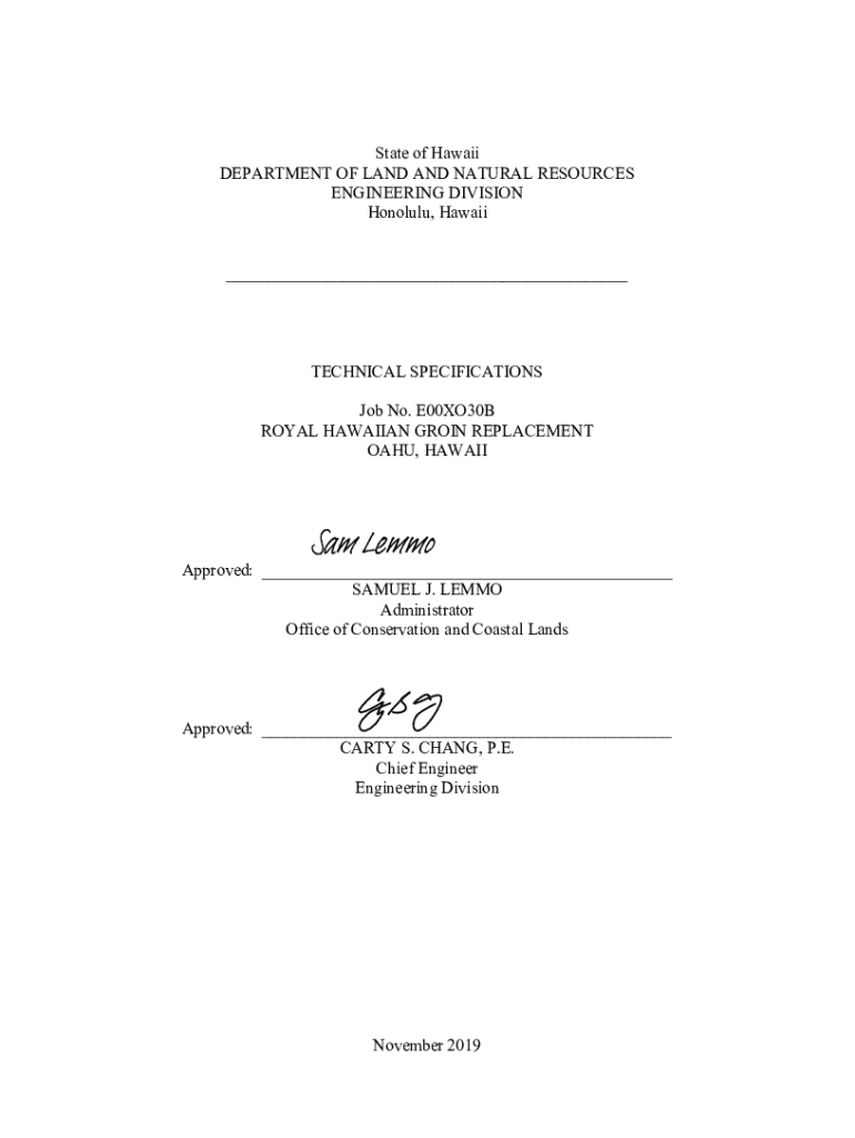 State of Hawaii DEPARTMENT OF LAND AND NATURAL RESOURCES ENGINEERING DIVISION Honolulu, Hawaii ___TECHNICAL SPECIFICATIONS Job No. E00XO30B ROYAL HAWAIIAN GROIN REPLACEMENT OAHU, HAWAIIApproved: ___