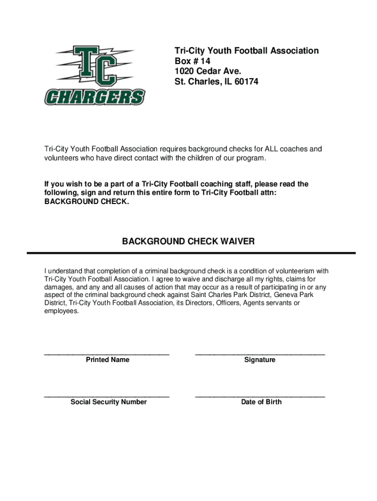Trinity Youth Football Association Box # 14 1020 Cedar Ave. St. Charles, IL 60174TriCity Youth Football Association requires background checks for ALL coaches and volunteers who have direct contact