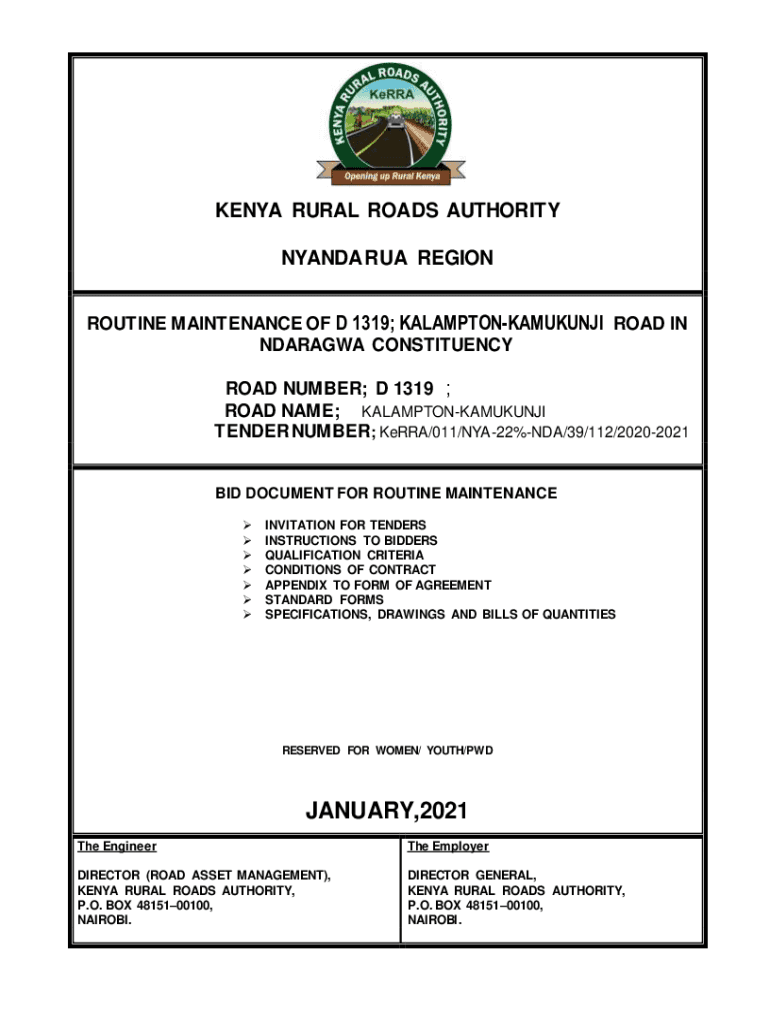 TENDER NUMBER; Kerry/011/NYA22%NDA/39/112/20202021BID