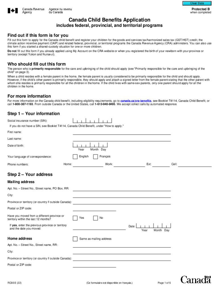 Clear DataProtected B when completed Canada Child Benefits Application includes federal, provincial, and territorial programs Find out if this form is for you Fill out this form to apply for the Canada