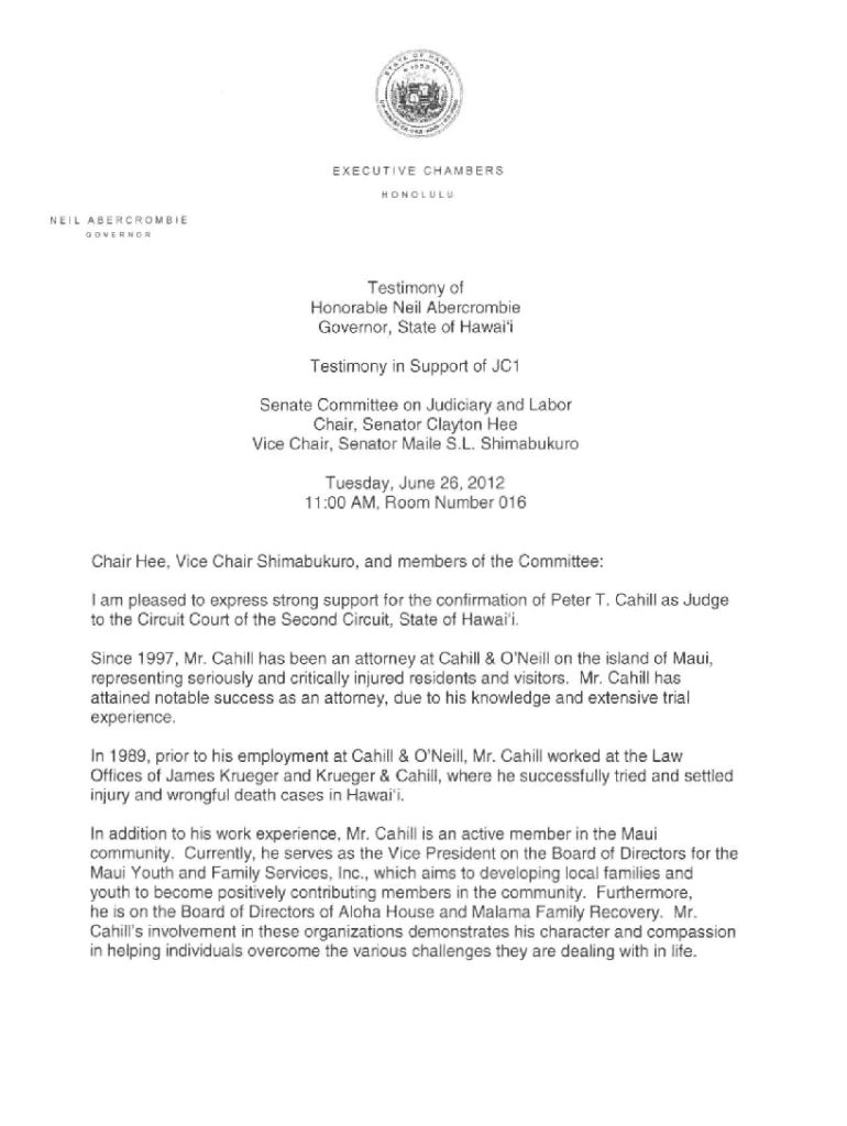 EXECUTIVE C H AMBER HO NO LULU NE I L A8ERCRO M 81E GOV [RIO Testimony of Honorable Neil Abercrombie Governor, State of Hawaii\'i Testimony in Support of JC1 Senate Committee on Judiciary and Labor