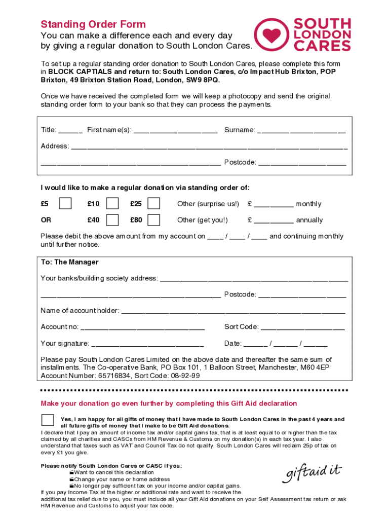 Standing Order Form You can make a difference each and every day by giving a regular donation to South London Cares. To set up a regular standing order donation to South London Cares, please complete