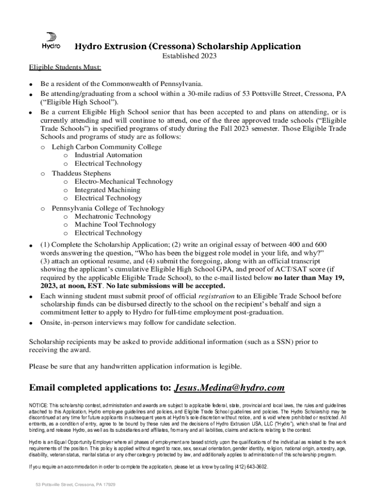 Established 2023 Eligible Students Must: Be a resident of the Commonwealth of Pennsylvania. Be attending/graduating from a school within a 30mile radius of 53 Pottsville Street, Cessna, PA (Eligible