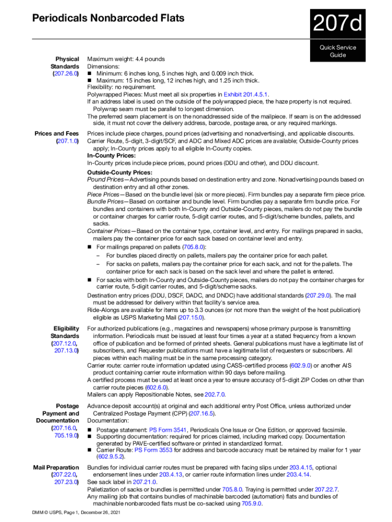 Periodicals Barcoded Pataphysical Standards (207.26.0)Prices and Fees (207.1.0)207d Quick Service GuideMaximum weight: 4.4 pounds Dimensions: Minimum: 6 inches long, 5 inches high, and 0.009 inch