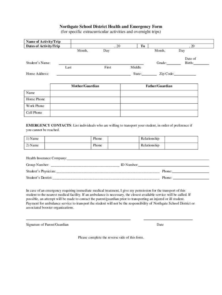 North gate School District Health and Emergency Form (for specific extracurricular activities and overnight trips) Name of Activity/Trip Dates of Activity/Trip, 20 Month, Today, 20 Months, Students