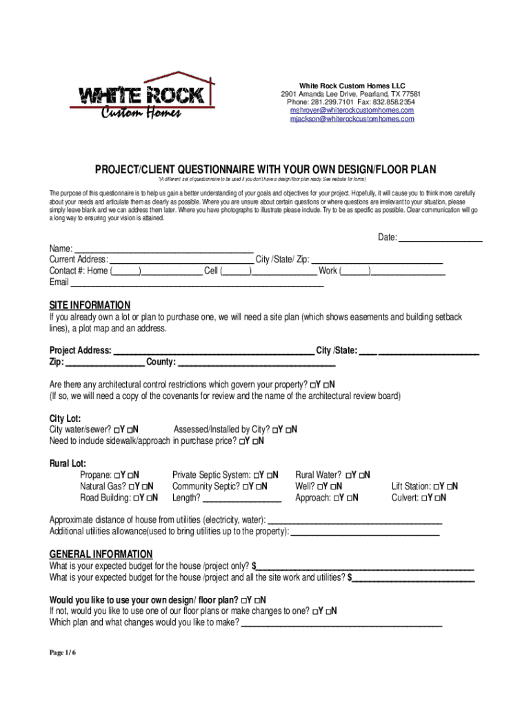 White Rock Custom Homes LLC 2901 Amanda Lee Drive, Pearland, TX 77581 Phone: 281.299.7101 Fax: 832.858.2354 mshroyer@whiterockcustomhomes.com mjackson@whiterockcustomhomes.comPROJECT/CLIENT QUESTIONNAIRE