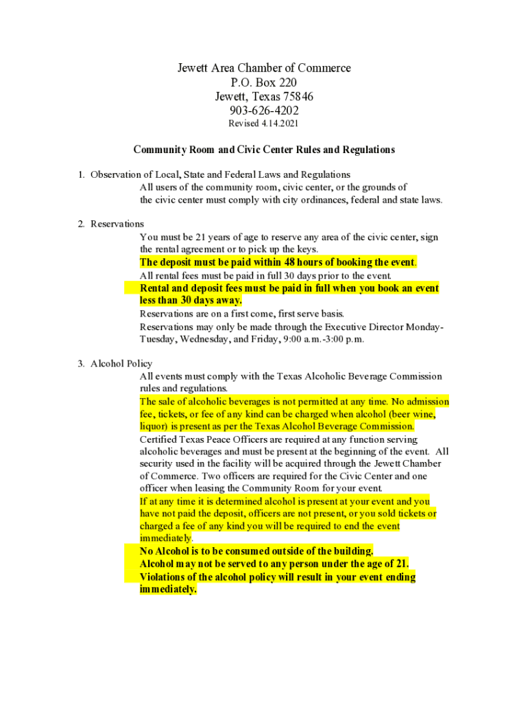Jewett Area Chamber of Commerce P.O. Box 220 Jewett, Texas 75846 9036264202 Revised 4.14.2021Community Room and Civic Center Rules and Regulations 1. Observation of Local, State and Federal Laws and