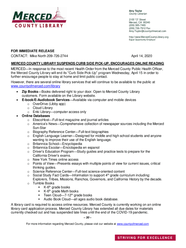 Amy Taylor County Librarian 2100 O Street Merced, CA 95340 (209) 3857485 (209) 7267912 Fax Amy.Taylor@countyofmerced.com http://www.MercedCountyLibrary.org Equal Opportunity Employer IMMEDIATE RELEASE