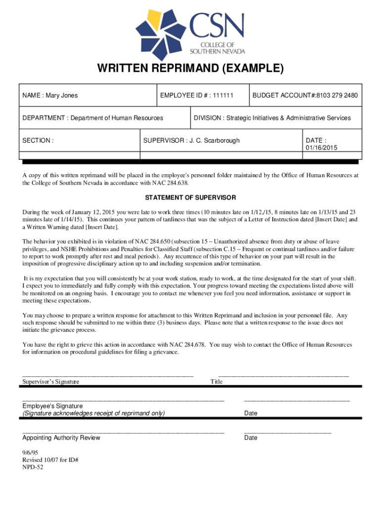 Get the free AP IV-1 EXHIBIT C SAMPLE WRITTEN REPRIMAND (The ...