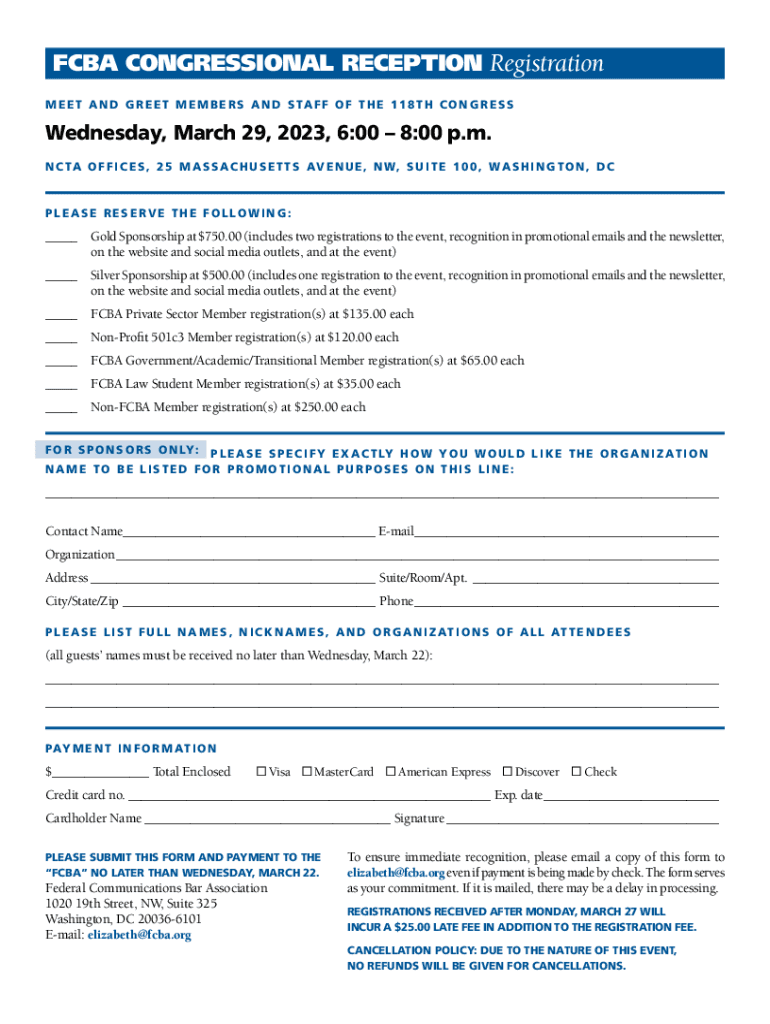 CBA CONGRESSIONAL RECEPTION Registration M E E T A N D G R E E T M E M B E R S A N D S TA F O F T H E 1 1 8 T H C O N G R E SS Wednesday, March 29, 2023, 6:00 8:00 p.m. N C TA O F F I C E S, 2 5 M