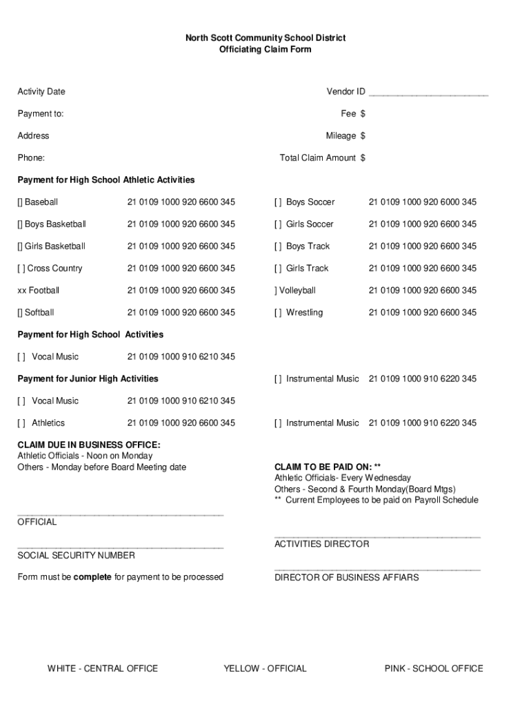 Officiating Claim Reactivity DateVendor ID ___Payment to:Fee $AddressMileage phone:Total Claim Amount payment for High School Athletic Activities