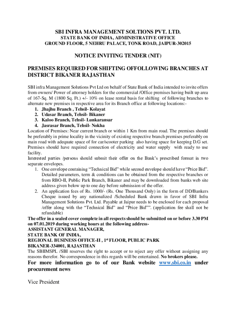 SBI INFRA MANAGEMENT SOLUTIONS PVT. LTD. STATE BANK OF INDIA, ADMINISTRATIVE OFFICE First FLOOR, 5 NEHRU PALACE, TOOK ROAD, JAIPUR302015NOTICE INVITING TENDER (NIT) PREMISES REQUIRED FOR SHIFTING