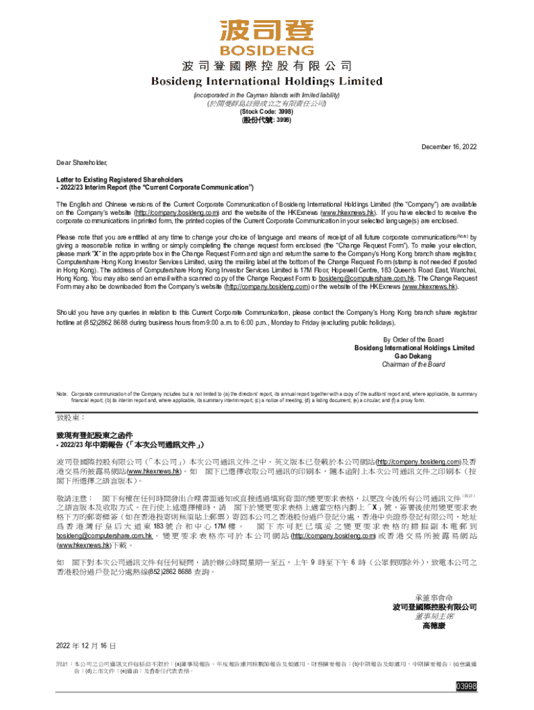 (incorporated in the Cayman Islands with limited liability) () (Stock Code: 3998) (: 3998)December 16, 2022, Dear Shareholder, Letter to Existing Registered Shareholders 2022/23 Interim Report (the