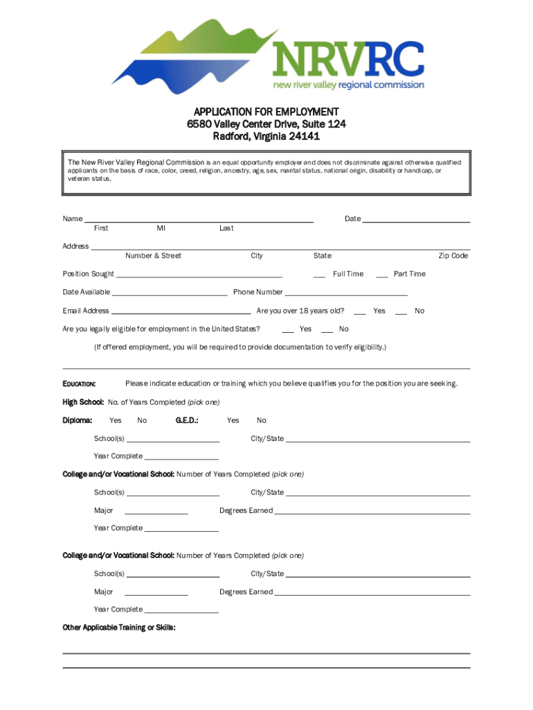 APPLICATION FOR EMPLOYMENT 6580 Valley Center Drive, Suite 124 Bradford, Virginia 24141 The New River Valley Regional Commission is an equal opportunity employer and does not discriminate against