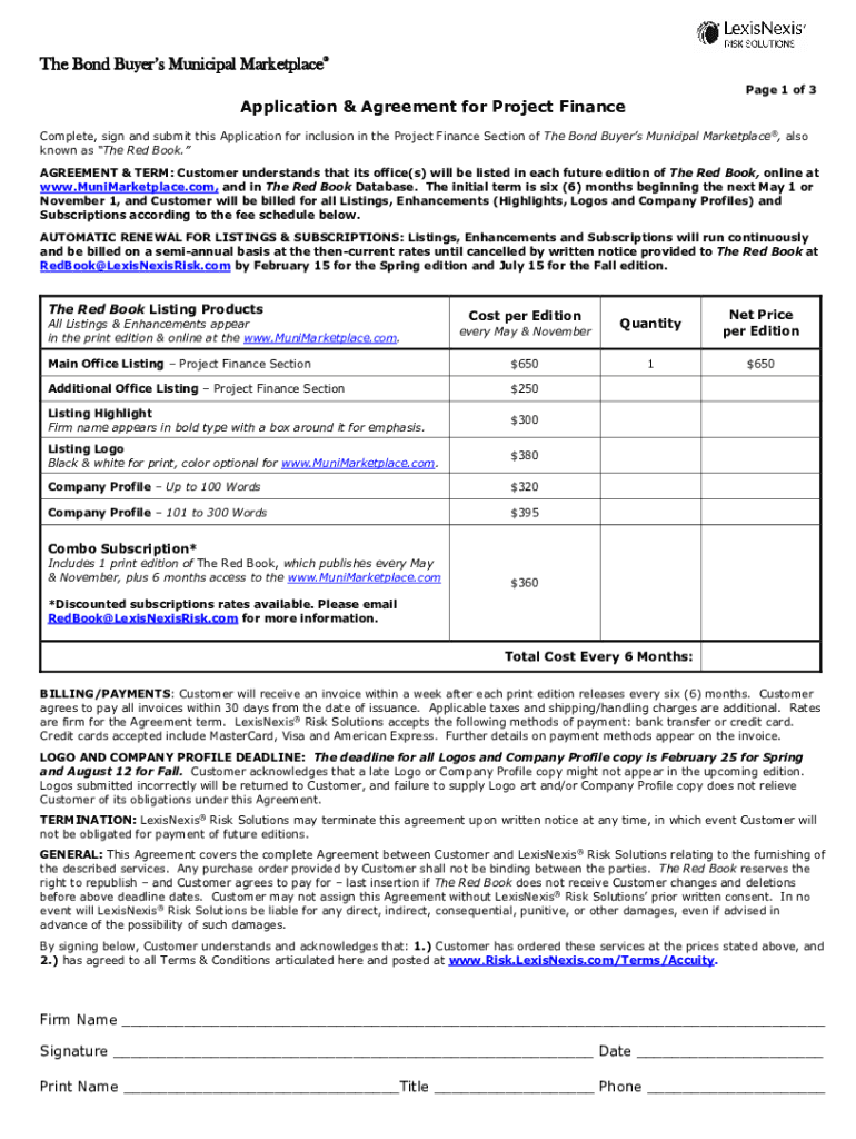 Page 1 of 3Application & Agreement for Project FinanceComplete, sign and submit this Application for inclusion in the Project Finance Section of The Bond Buyers