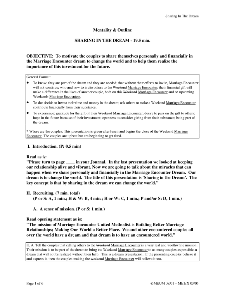 Sharing In The DreamMentality & Outline SHARING IN THE DREAM 19.5 min.OBJECTIVE: To motivate the couples to share themselves personally and financially in the Marriage Encounter dream to change the