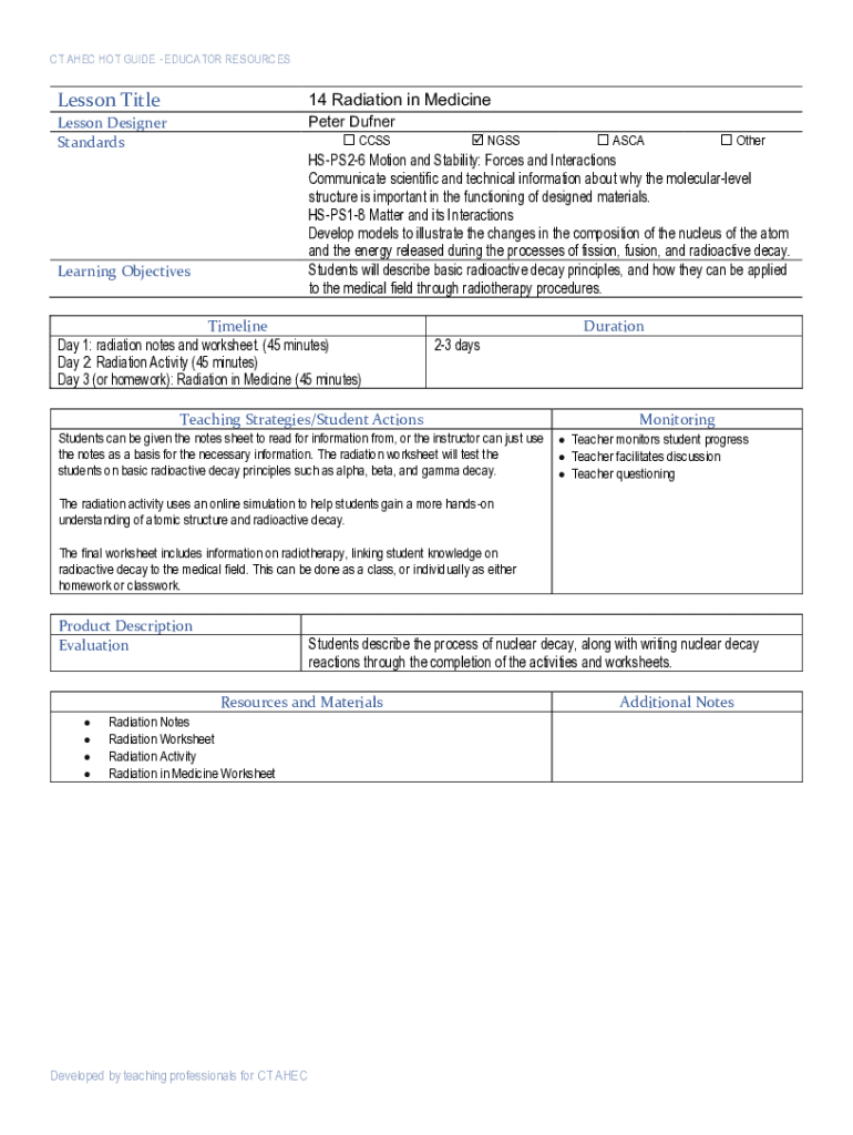CTA HEC HOT GUIDE EDUCATOR RESOURCESLesson Title14 Radiation in MedicineLesson Designer Standards Peter Duffer CCSS GNSS ASIA OtherHSPS26 Motion and Stability: Forces and Interactions Communicate