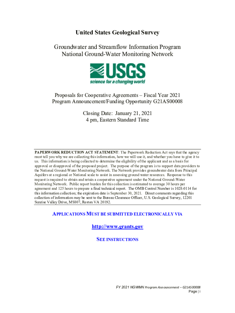 United States Geological Survey Groundwater and Stream flow Information Program National Groundwater Monitoring NetworkProposals for Cooperative Agreements Fiscal Year 2021 Program Announcement/Funding