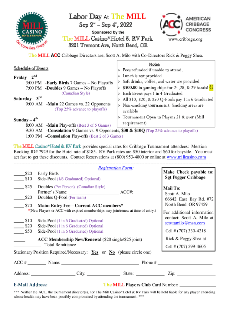 Sponsored by teethe MILL Casino×Hotel & RV Parkway.cribbage.org3201 Tremont Ave, North Bend, OR