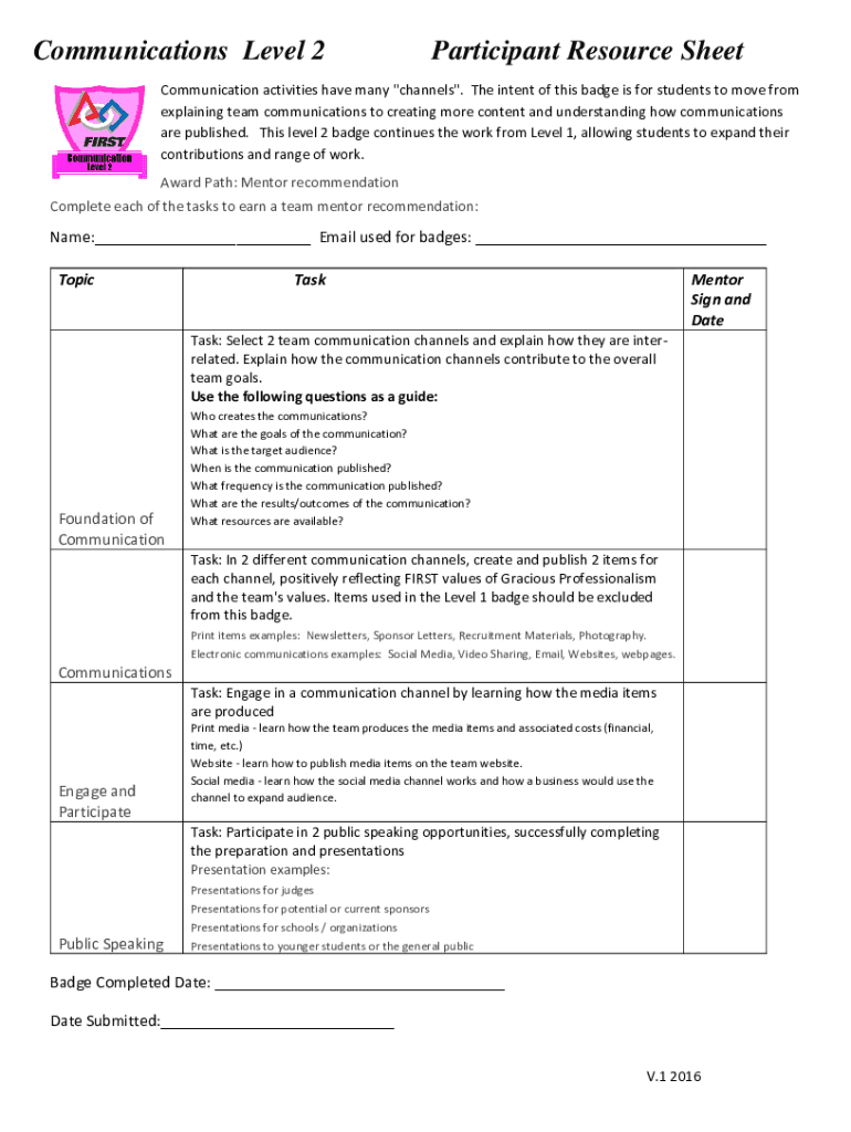Communications Level 2 Participant Resource Sheet Communication activities have many \” channels\”. The intent of this badge is for students to move from Sheet explaining team communications to