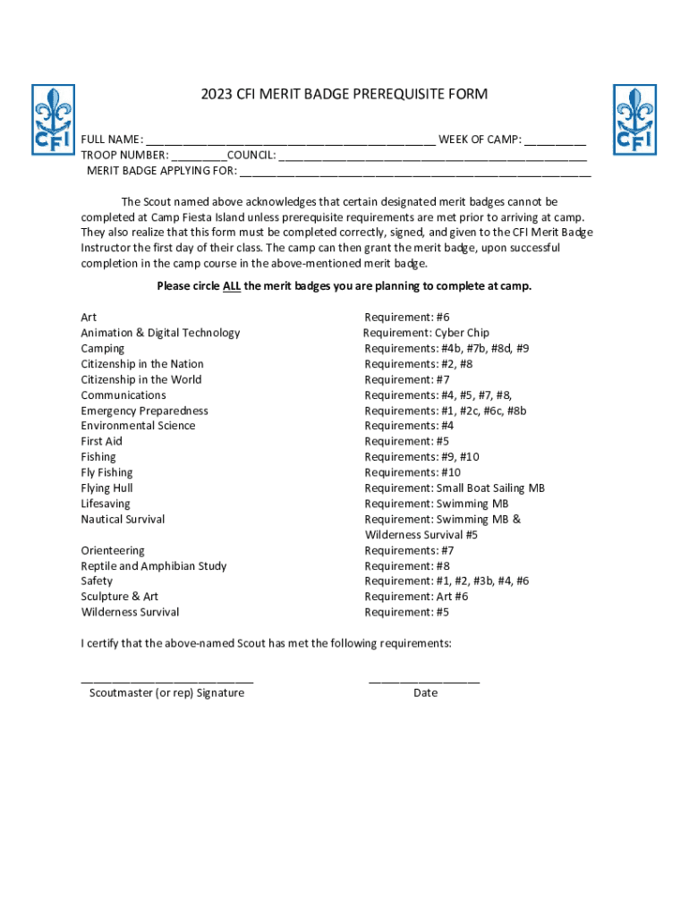 2023 CFI MERIT BADGE PREREQUISITE FORM FULL NAME: ___ WEEK OF CAMP: ___ TROOP NUMBER: ___COUNCIL: ___ MERIT BADGE APPLYING FOR: ___ The Scout named above acknowledges that certain designated merit