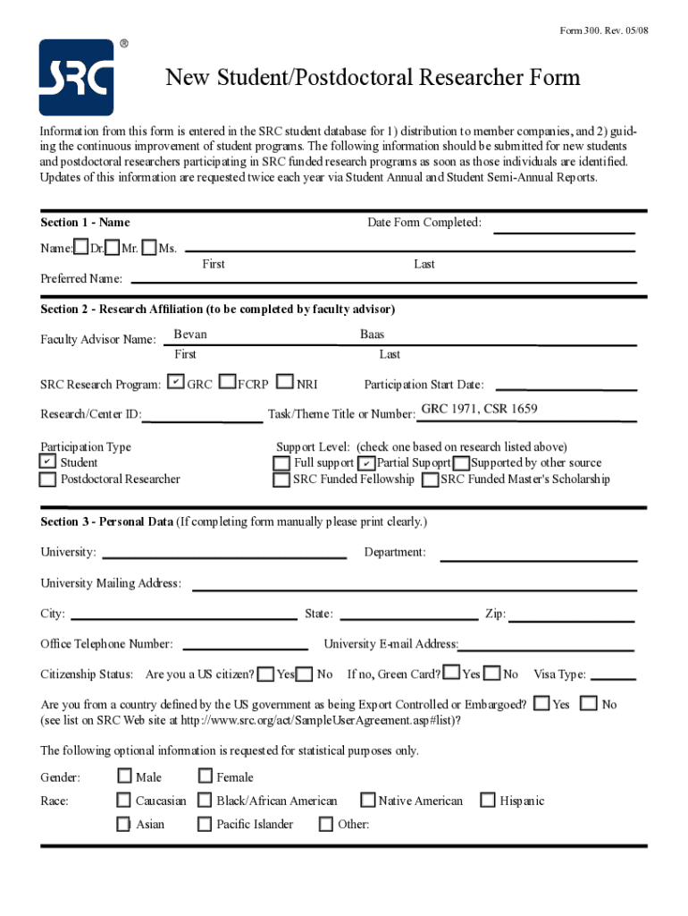 Form 300. Rev. 05/08New Student/Postdoctoral Researcher Form Information from this form is entered in the SRC student database for 1) distribution to member companies, and 2) guiding the continuous
