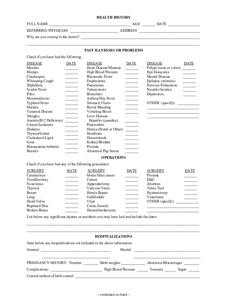 HEALTH HISTORY FULL NAME ___ AGE ___ DATE ___ REFERRING PHYSICIAN ___ ADDRESS ___ Why are you coming to the doctor? ___ ___ PAST ILLNESSES OR PROBLEMS Check if you have had the following: DISEASE