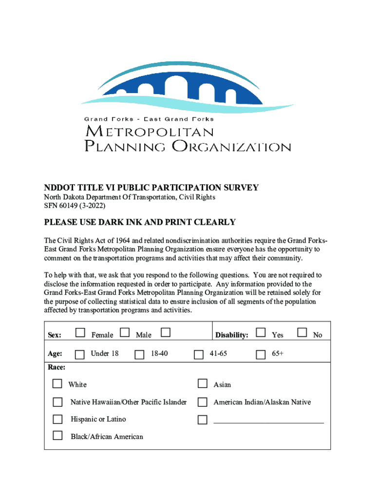 Get the free NDDOT TITLE VI PUBLIC PARTICIPATION SURVEY