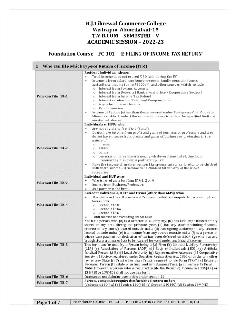R.J. Liberal Commerce College Vastrapur Ahmedabad15 T.Y.B.COM SEMESTER V ACADEMIC SESSION 202223 Foundation Course FC301 FILING OF INCOME TAX RETURN 1. Who can file which type of Return of Income