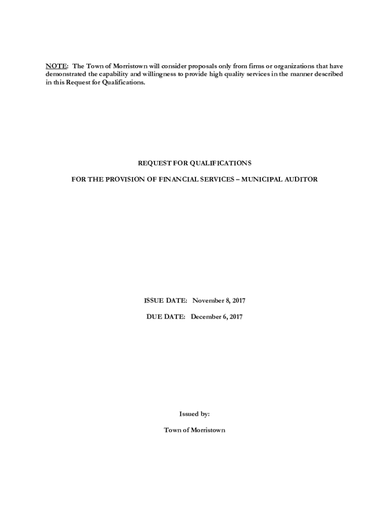 NOTE: The Town of Morristown will consider proposals only from firms or organizations that have demonstrated the capability and willingness to provide high quality services in the manner described