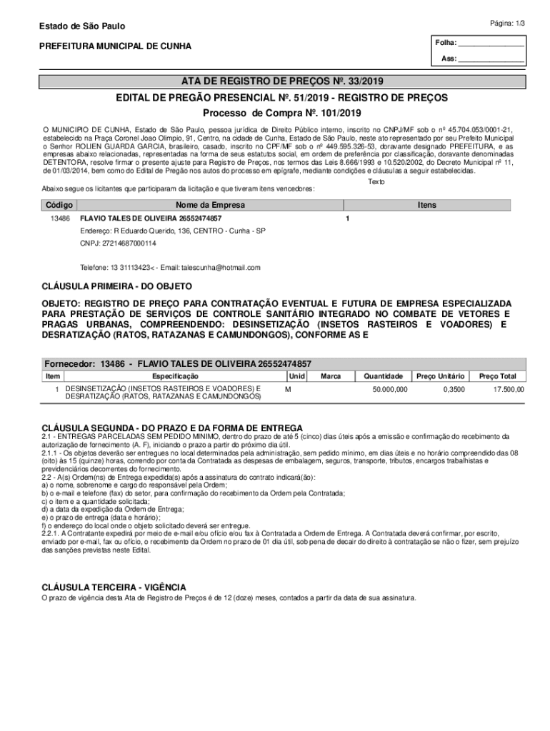 Fol ha: ___PREFECTURE MUNICIPAL DE Canvass: ___ATA DE REGISTRY DE PRESS N. 33/2019