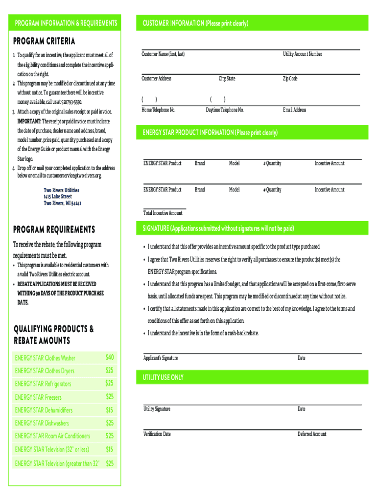 ENERGY STAR INCENTIVE PROGRAM Two Rivers Utilities customers can receive an incentive on the purchase of certain ENERGY STAR rated products (products must have ENERGY STAR label). Incentive applications