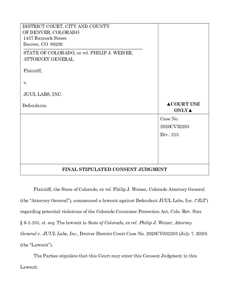 DISTRICT COURT, CITY AND COUNTY OF DENVER, COLORADO 1437 Bannock Street Denver, CO 80202 STATE OF COLORADO, ex rel. PHILIP J. WEISER, ATTORNEY GENERAL Plaintiff, v. JUUL LABS, INC. Defendants. COURT