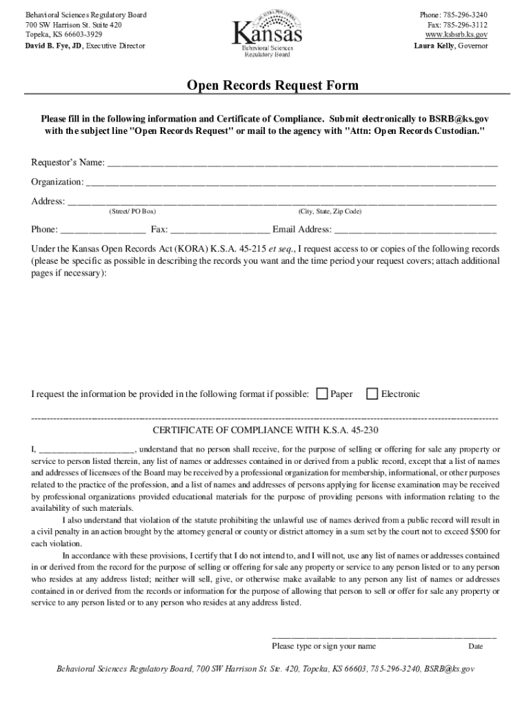 Behavioral Sciences Regulatory Board Open Records Policy and Procedures It is the official policy of the Kansas Behavioral Sciences Regulatory Board (herein after, the Board) that public records maintained