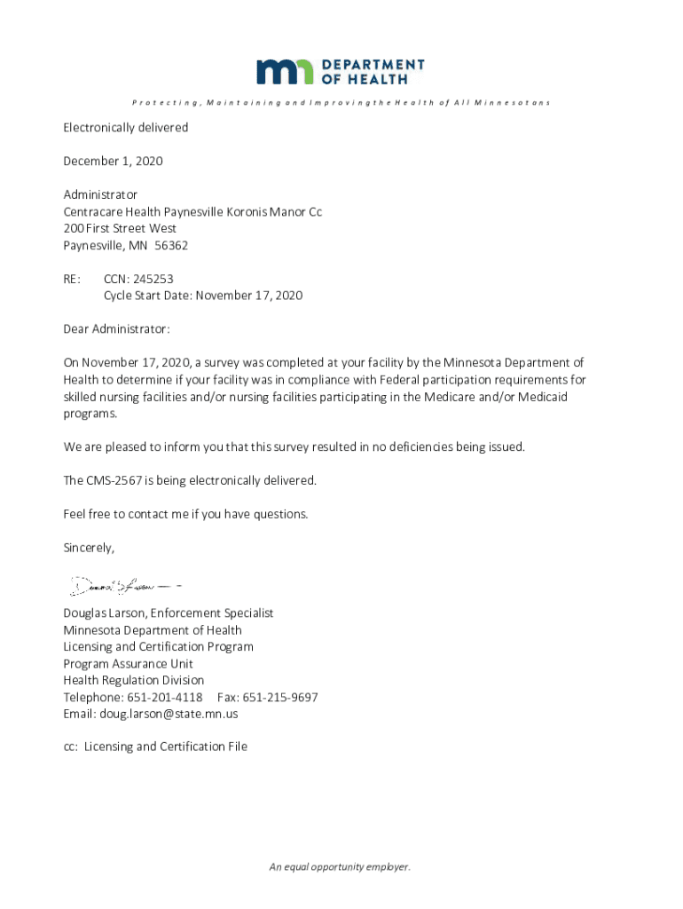 Protecting, MaintainingandImprovingtheHealthofAllMinnesotans Electronically delivered December1,2020 Administrator CentracareHealthPaynesvilleKoronisManorCc 200FirstStreetWest Painesville,MN56362