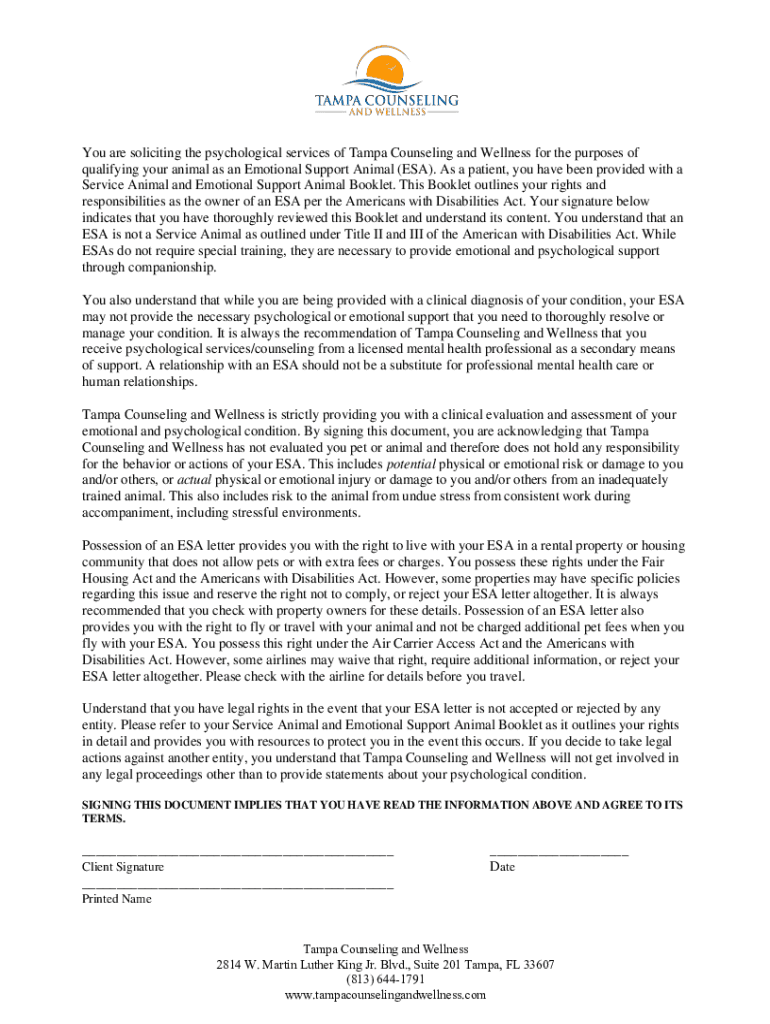 You are soliciting the psychological services of Tampa Counseling and Wellness for the purposes of qualifying your animal as an Emotional Support Animal (ESA). As a patient, you have been provided