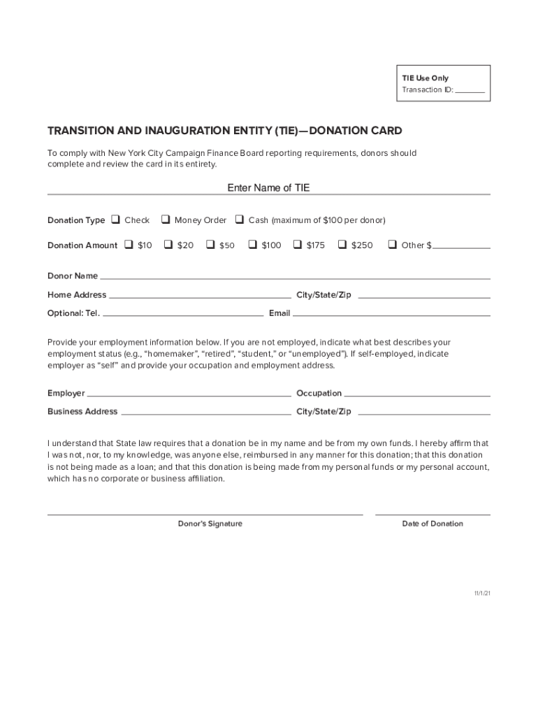 Transaction ID:TRANSITION AND INAUGURATION ENTITY (TIE)DONATION CARD