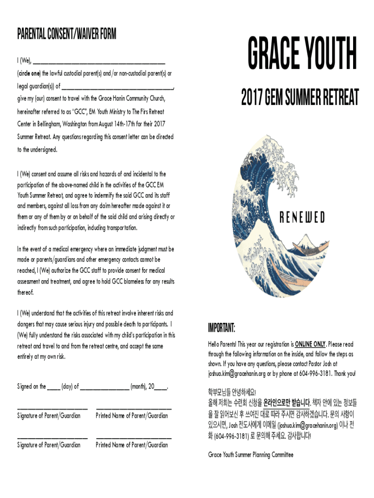 Parental consent/waiver Form Grace Youth (We), ___ (circle one) the lawful custodial parent(s) and/or noncustodial parent(s) or legal guardian(s)) of ___, give my (our) consent to travel with the