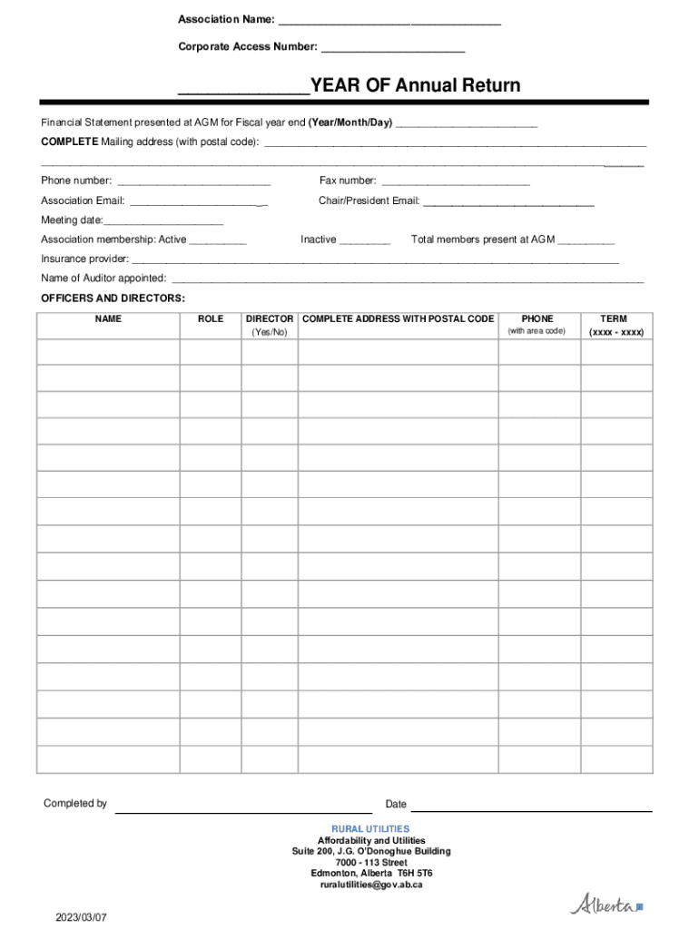 Association Name: ___ Corporate Access Number: ______YEAR OF Annual Return Financial Statement presented at AGM for Fiscal year-end (Year/Month/Day) ___ COMPLETE Mailing address (with postal code):