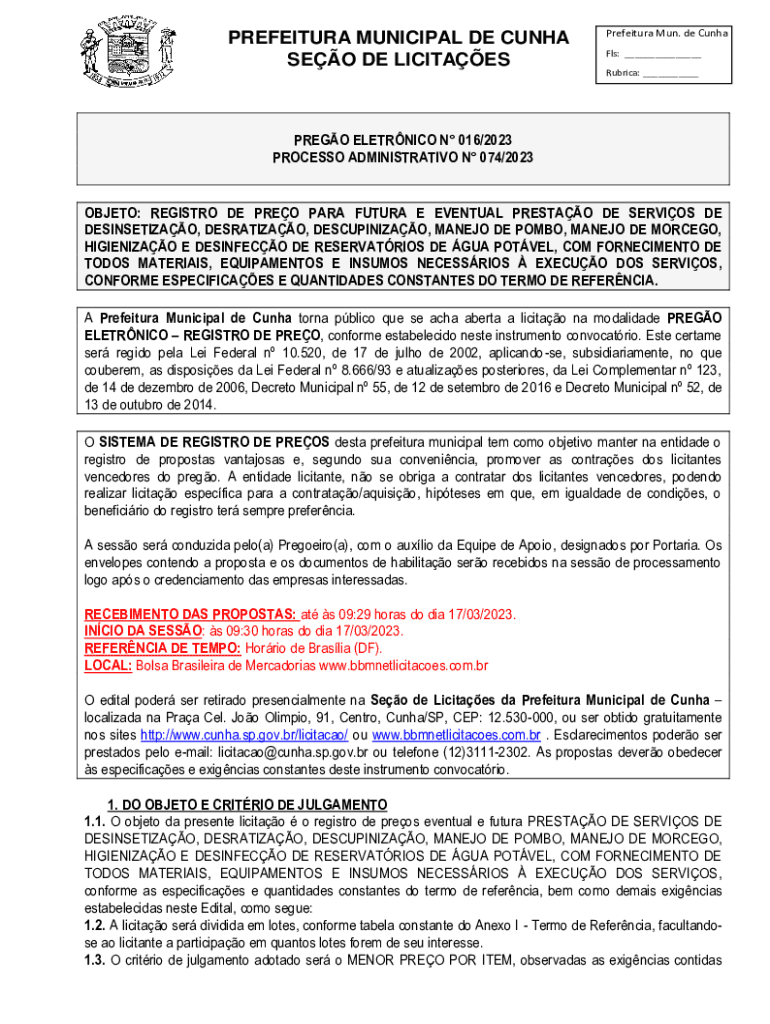 PROCESS ADMINISTRATIVE N 074/2023OBJETO: REGISTRY DE PRO PARA FUTURE E EVENTUAL PRESTO