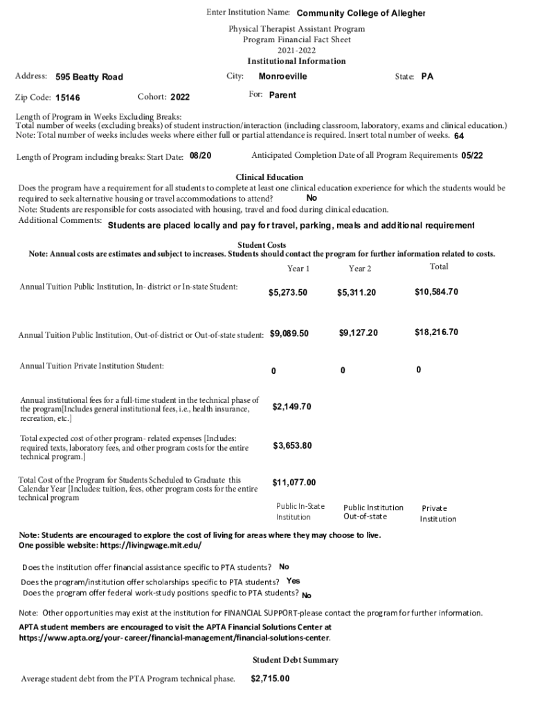 Enter Institution Name: Community College of Allegheny County Physical Therapist Assistant Program Financial Fact Sheet 20212022 Institutional Information Address: 595 Beatty Road Zip Code: 15146Cohort: