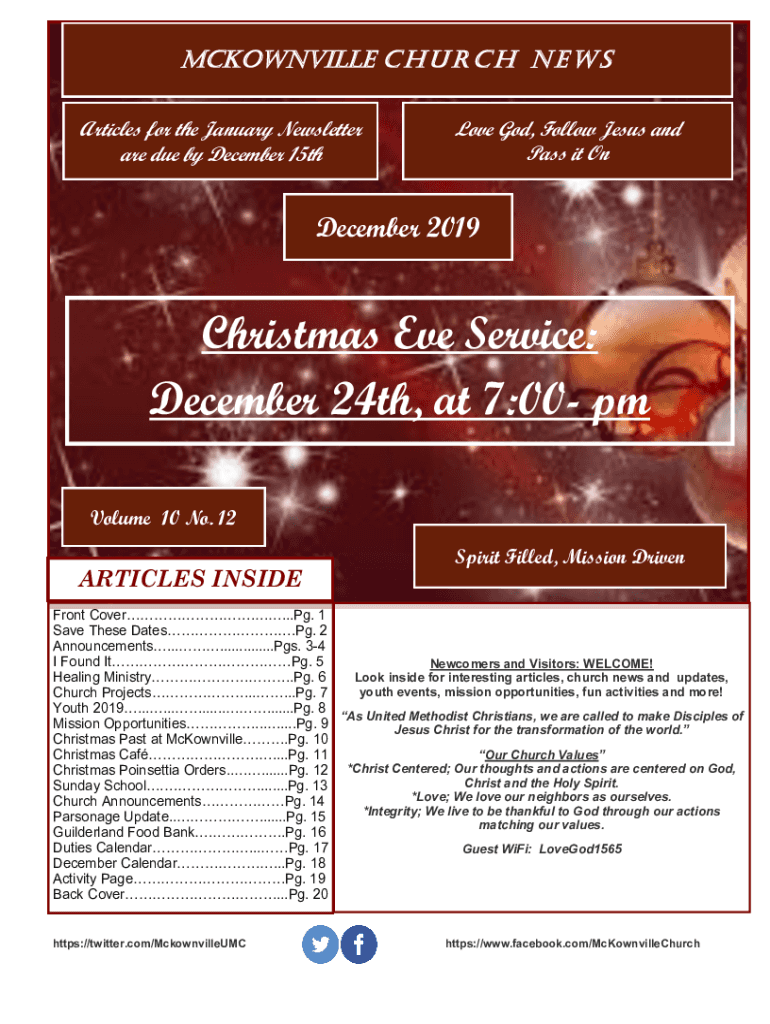 McMinnville C h u r c h N e w s Articles for the January Newsletter are due by December 15thLove God, Follow Jesus and Pass it On December 2019Christmas Eve Service: December 24th, at 7:00 pm Volume