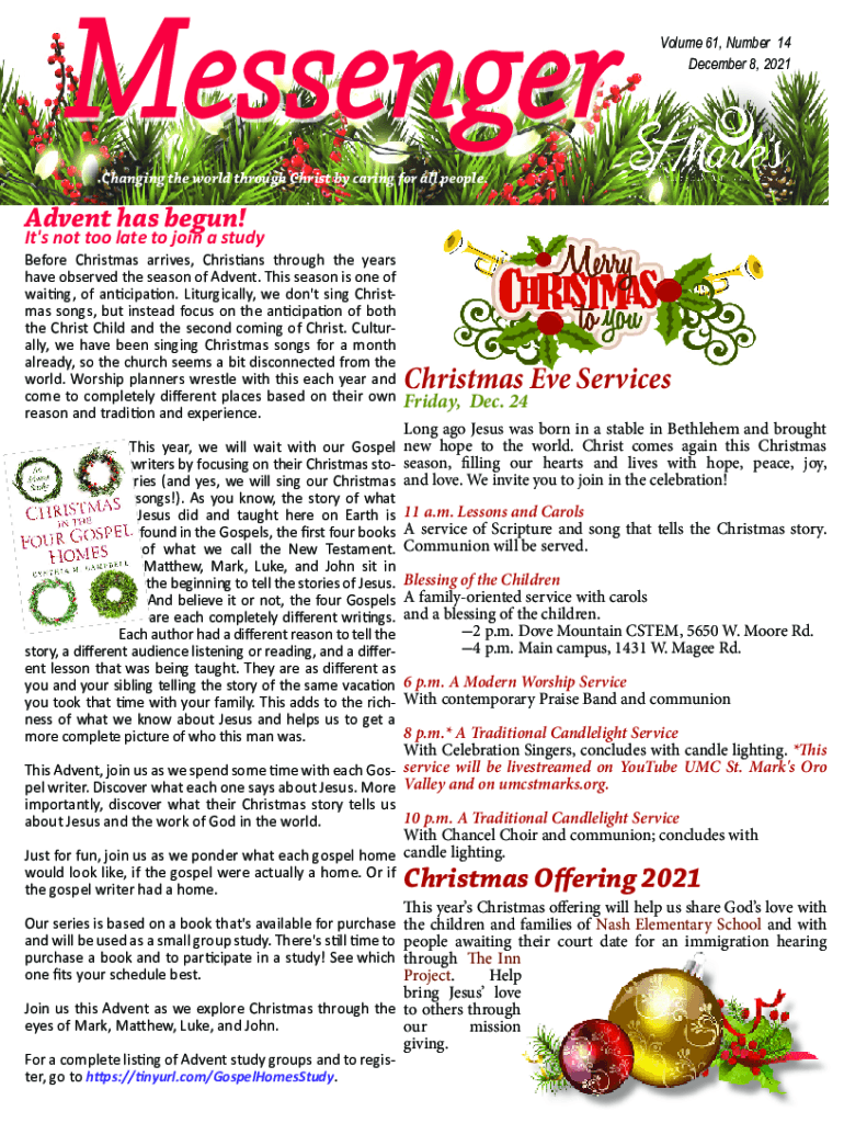 Volume 61, Number 14 December 8, 2021Changing the world through Christ by caring for all people. Advent has begun! It\'s not too late to join a studyBefore Christmas arrives, Christians through the