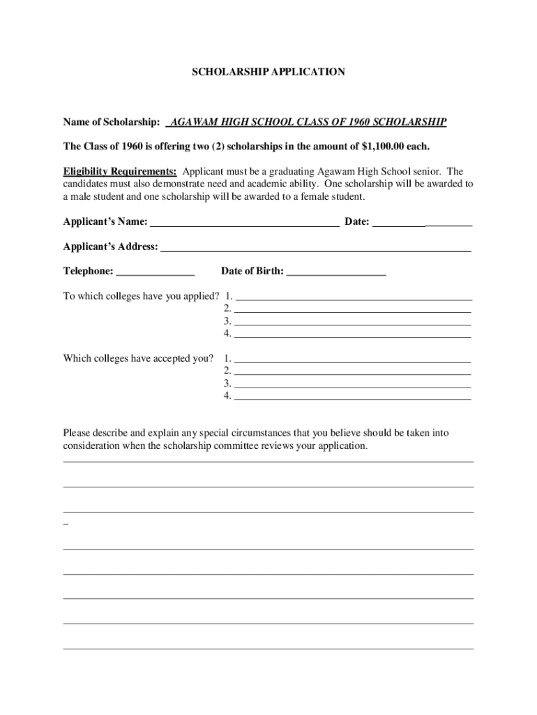 SCHOLARSHIP APPLICATIONName of Scholarship: _ARAWAK HIGH SCHOOL CLASS OF 1960 SCHOLARSHIP The Class of 1960 is offering two (2) scholarships in the amount of $1,100.00 each. Eligibility Requirements: