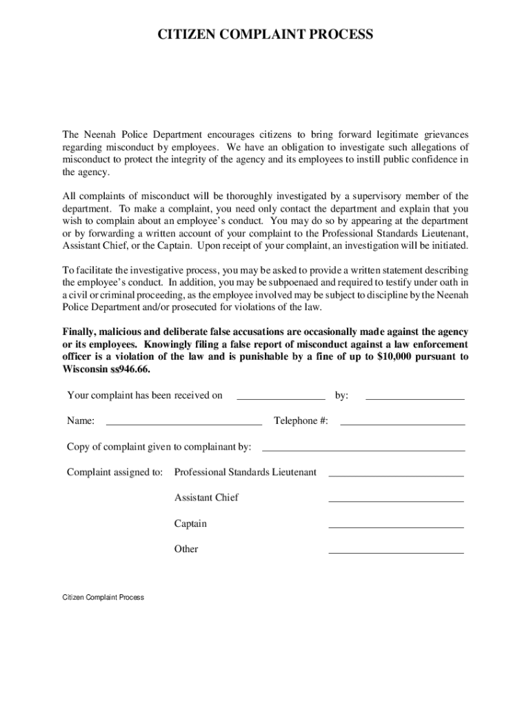 Get the free Neenah Police Department Citizen Complaint Report