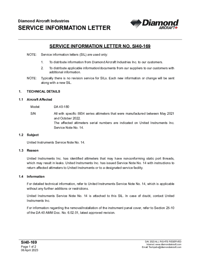 Diamond Aircraft IndustriesSERVICE INFORMATION LETTER SERVICE INFORMATION LETTER NO. SI40169 NOTE:NOTE:Service information letters (SIL) are used only: 1. To distribute information from Diamond Aircraft