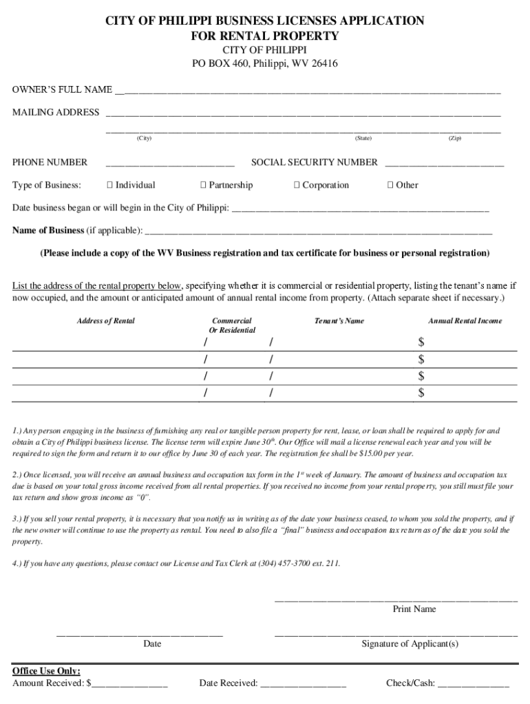 CITY OF PHILIPPE BUSINESS LICENSES APPLICATION FOR RENTAL PROPERTY CITY OF PHILIPP IPO BOX 460, Philippe, WV 26416 OWNERS FULL NAME ___ MAILING ADDRESS ___ ___ (City)(State)PHONE NUMBER___Type of